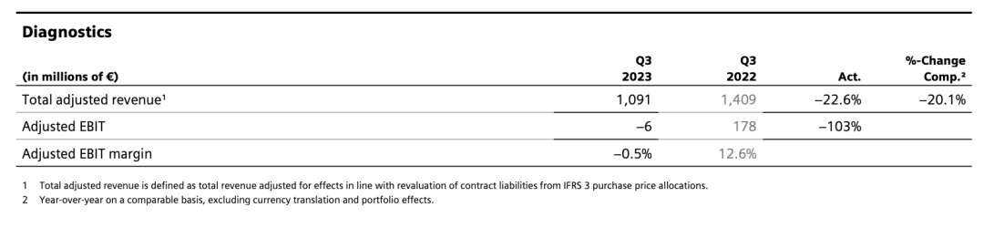由于快速COVID-19抗原测试业务的需求降低,诊断收入在可比基础上下降了20.1%;不包括抗原测试的可比收入增长了2.0%;调整后的EBIT利润率-0.5%;不包括快速抗原测试和转化成本1.0%;