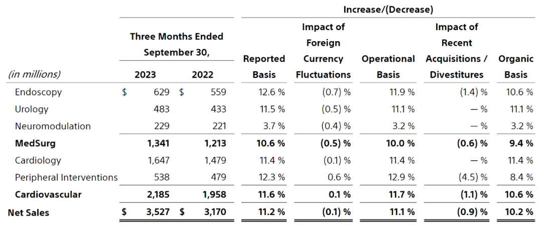 在2023年第三季度,波士顿科学公司净销售额为35.27亿美元,与上一年同期相比,报告增长11.2%,按业务和地区划分的第三季度净销售额: