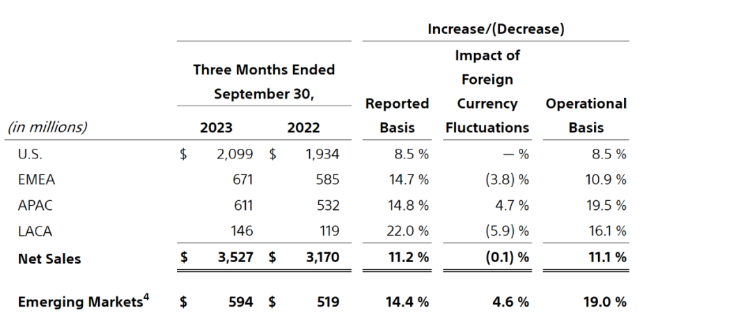 该公司估计,与去年同期相比,2023年第四季度的净销售额增长率在报告的基础上约为9%至11%,有机增长率约为8%至10%。第四季度有机净销售额指导不包括外币波动的影响和可归因于收购和剥离的净销售额,因为这些收购和剥离的可比净销售额少于整个时期。