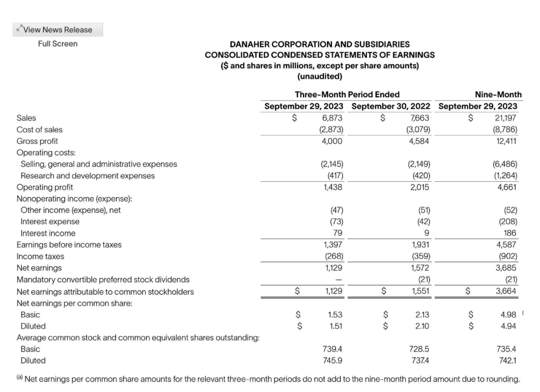 总的来说,Danaher报告显示,第三季度收入同比下降11%。截至9月30日的三个月内,收入从一年前的76.6亿美元下降到68.7亿美元,但高于华尔街的共识估计的62.6亿美元。核心收入按非通用会计准则年同比下降近12%,包括基本业务的3%下降。