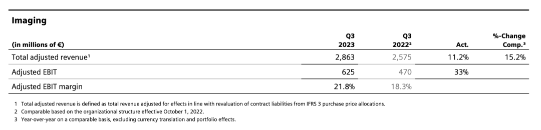 成像业务显示,可比收入增长15.2%;调整后的EBIT利润率明显高于同比去年三季度2达到1.8%;
