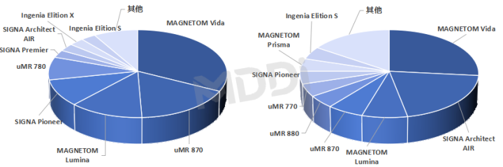 图5 2023年(左)与2024年(右)一季度中国1.5T磁共振成像设备各型号市场份额(销售量)