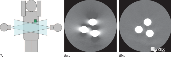 左:部分容积伪影的机制,当密集物体偏离中心部分突出到X射线束中时发生。(中,右) 三根直径12 mm的丙烯酸棒的CT图像,支撑在平行于扫描仪轴且距离扫描仪轴约15 cm的空气中。(中) 棒部分进入截面宽度获得的图像显示部分体积伪影。(右) 当棒完全进入截面宽度时获得的图像显示没有部分体积伪影。