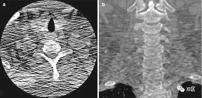 量子斑点。(a) 颈椎的轴位和(b)冠状位CT图像显示,由于大的体型和光子饥饿,解剖清晰度较差,特别是在肩部。在这些图像中,由于低信噪比,量子噪声更加明显。