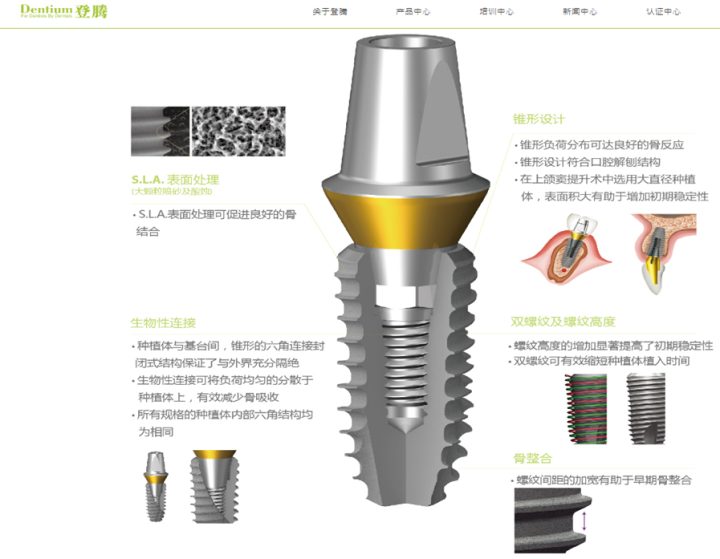 是什么:可以看到上图的种植体设计。将与人体骨质兼容性高的纯钛金属制造成类似牙根的圆柱体或螺纹形状,以外科小手术(开窗,备洞)的方式植入缺牙区的牙槽骨内,经过1~3 个月后,当人工牙根与牙槽骨密合后,安装基台用来稳定支撑连接种植体和牙冠,再安装牙冠。