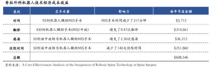 以脊柱机器人技术应用于脊柱外科手术为例,在美国市场,557例病例在1年时间里机器人手术共节省约410.8万元;手术时间节省3.4分钟,每年节省约3.9万元;机器人技术提高了椎弓根螺钉的精度,避免9.47次翻修,节省约合人民币212.4万元;住院总天数减少了140天,共节省约合人民币170万元;避免感染2.3例,节省约合人民币24.5万元。综合来看,每一年可以节省约合人民币4107,685.5元。可显著减少手术翻修率、降低感染率、住院时间和缩短手术时间。