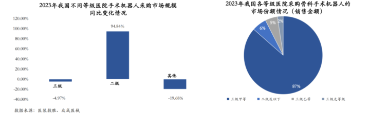 中国手术机器人的医院配置覆盖率进一步下沉,认可度和接受度明显改善。我国二级医院手术机器人采购市场规模增速为94.84%,增长速度最快,其次三级医院增速达到-4.97%,高于全国平均水平,成为行业增长第二快速度。随着2023年4月,首台腹腔手术机器人落户县级医院以来,县级医院手术机器人采购市场规模出现显著增长,2023年达到15.81%,远超其他级别医院。进一步说明手术机器人在我们基层医疗系统也存在着极大的需求和认可度。